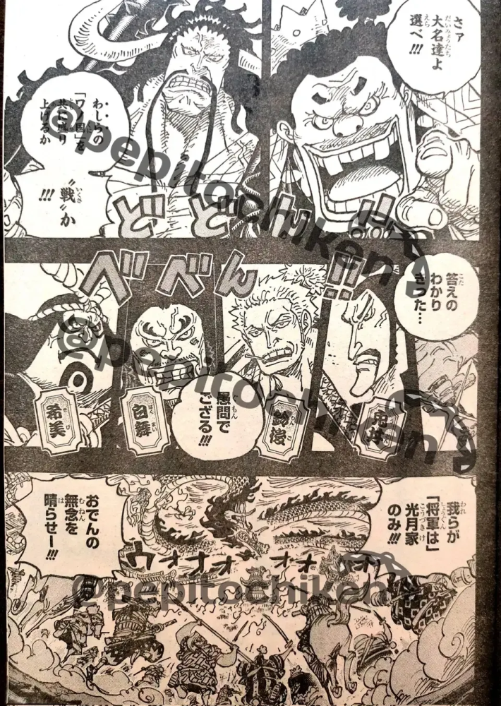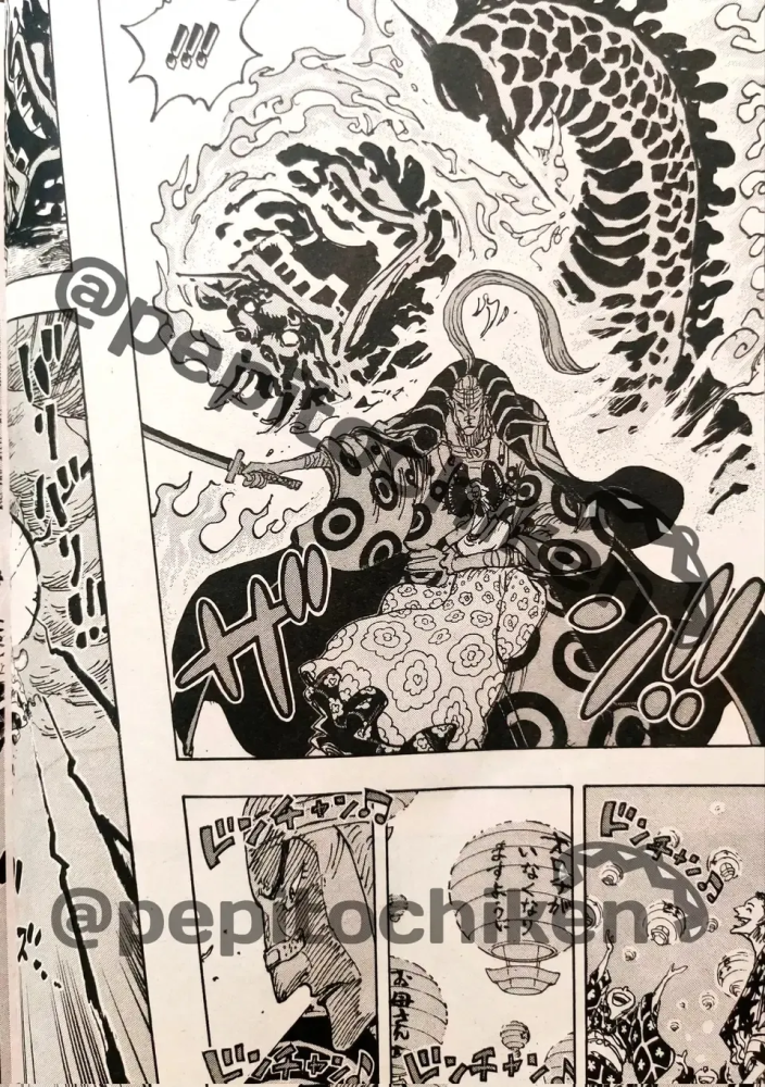 画面一闪,故事回到20年前,是处刑御田的那一天,和之国的武士们为报御田的恩惠,不畏凯多,勇敢迎战,但实力悬殊,结果都被干掉了。