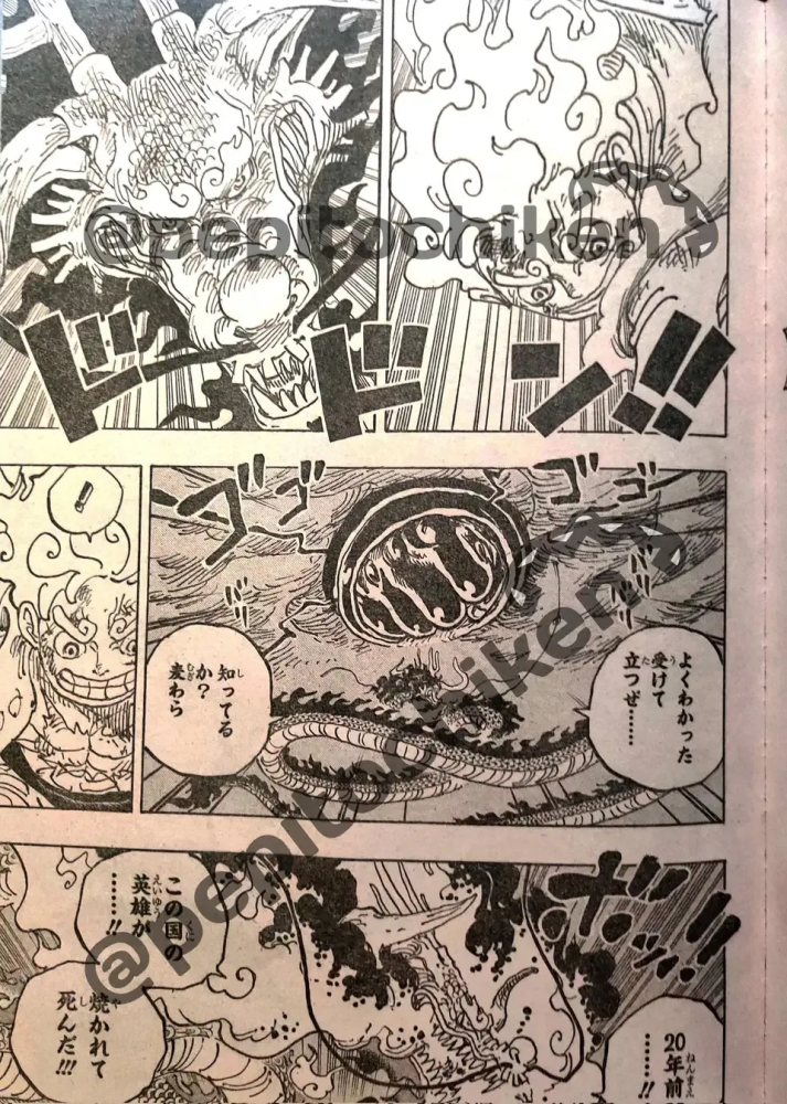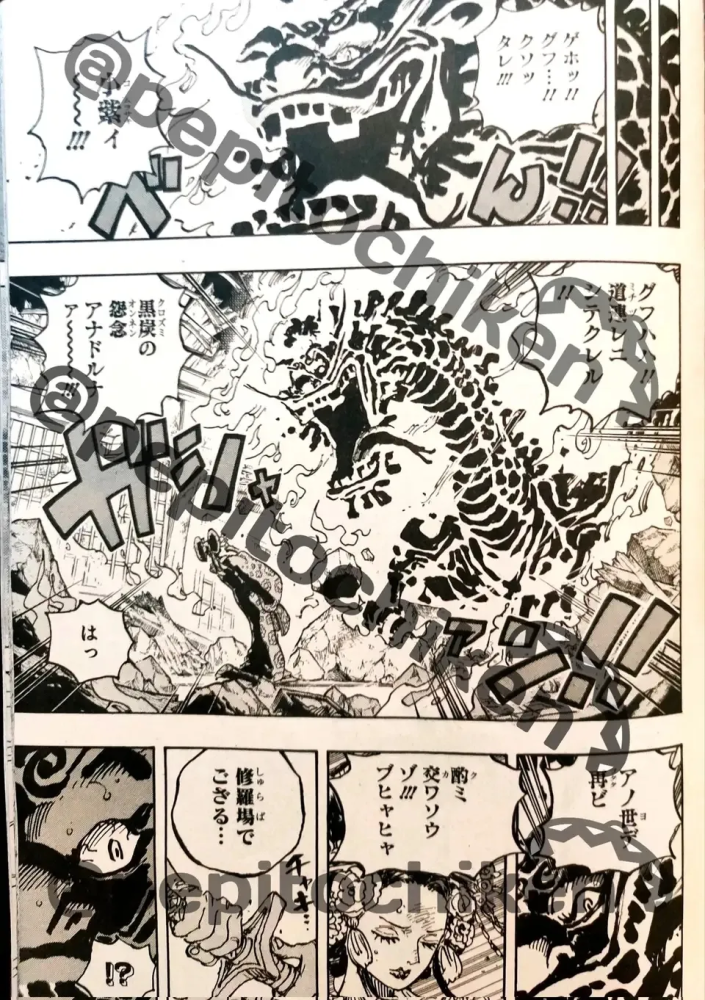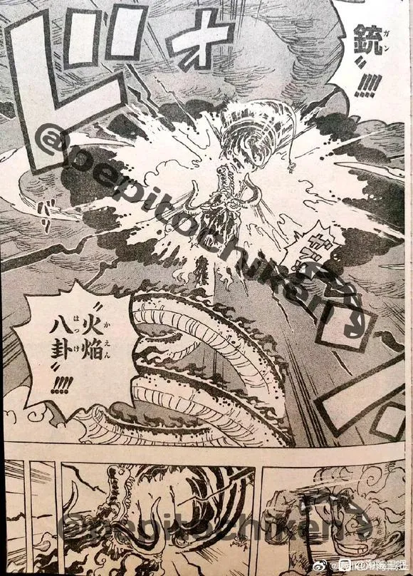 故事进入正篇,路飞的大拳头还在蓄力着,等待着让桃之助把鬼岛移开之后,给予凯多奋力一击。凯多迎难而上,嘴里吐出了热息。