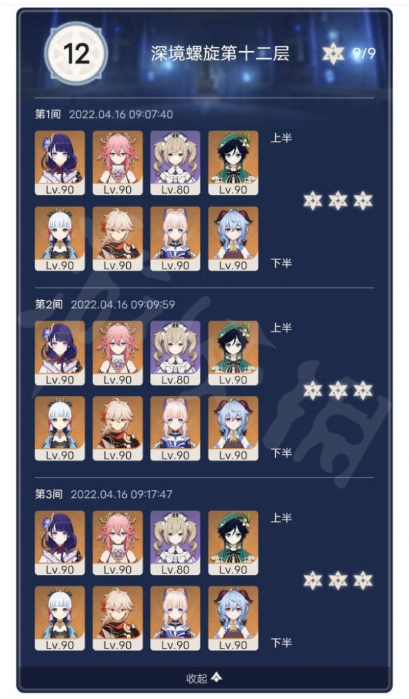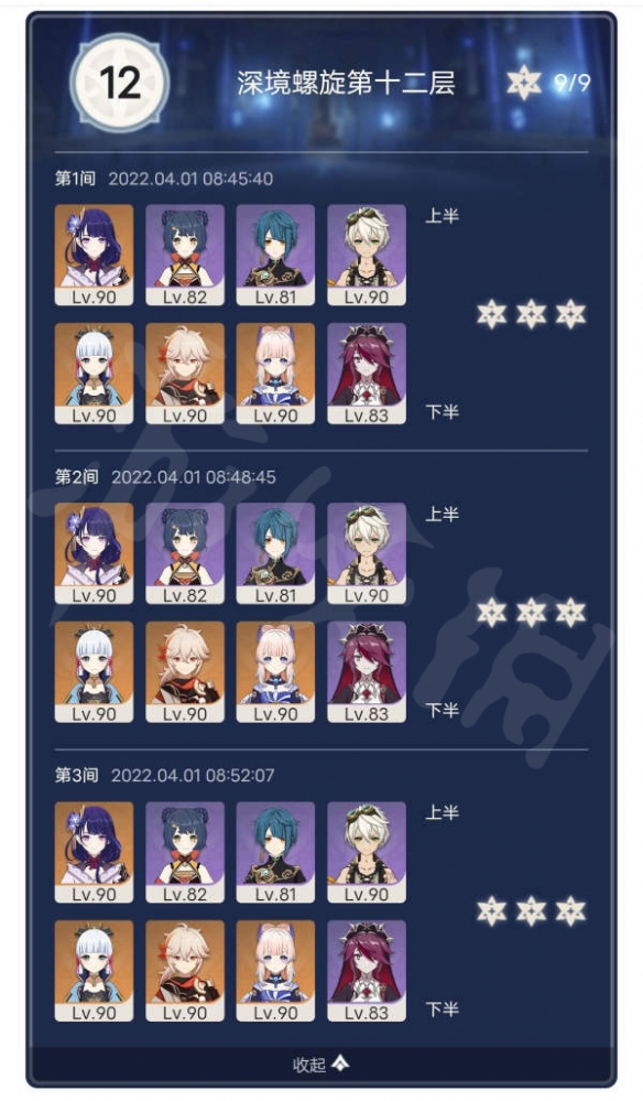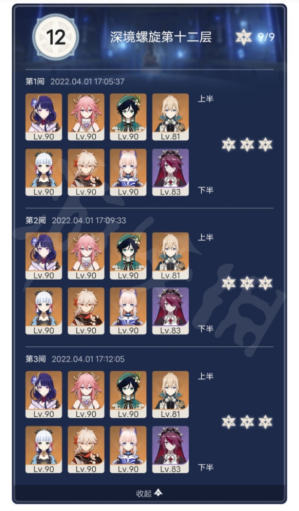 第三个思路,雷伤占较大比例(不是说所有刮盾都是雷伤打的),这个思路最常见的队伍就是武装队,也是我在这次深渊中使用的配队。由于本次深渊对于伤害要求低于前几次深渊,反而是上元素频率更高一些,因此实际操作起来,上雷频率更高一些的角色会比较吃香。期中就包括刻晴。