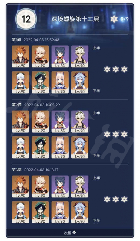 第二种思路就是正常的水伤占刮掉火盾比例最大的配队,期中比较有代表性的就是万达国际队。同时能达到这个要求的还有绫人的配队,由于本人没有绫人,之前用家人的绫人云堇温迪班尼特打上层,不过感觉没有公子效率高。