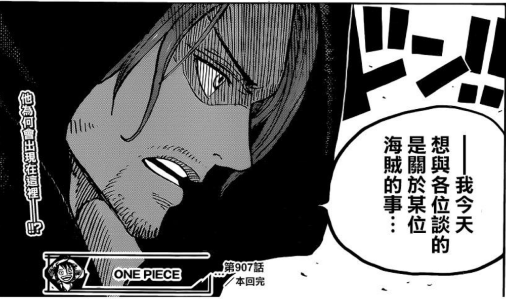 这是海盗香克斯在第907集《虚空的王座》中,突然出现在五老星所在的圣地玛丽乔亚的盘古古堡“权力之间”时所说的台词。毫不夸张地说,《海贼王》是最让所有读者热血沸腾的神秘台词。