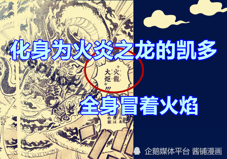 第一,本次情报图中,提到的是凯多化身为究极的【炎之龙】,全身散发着好似可以熔 化一切岩浆与火焰,在变身前,凯多的技能名称是【火龙大炬】,面对路飞的巨大拳头,凯多这 是拿出压箱底的大绝招来反击,但希望极度渺茫。