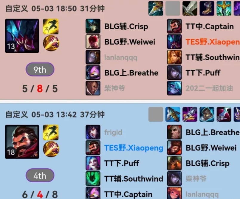 步入LPL春季转会期,尝试离队的TES小鹏试训TT!BLG众将应战,出战五位选手分别是上单呼吸哥、打野Weiwei、中单Fofo、AD选手Doggo,以及LOL冠军辅助撕少Crisp,暂别赛场的小狗Uzi遗憾缺席。