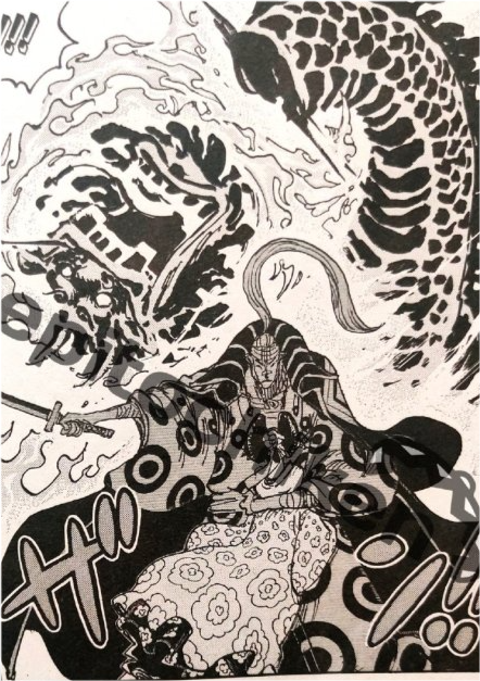 上一话结尾,路飞使出一招巨拳,本话正式命名为“猿神枪”,似乎是“大猿王枪”加上流樱的升级版。凯多最后也用上了新招,他喷出大量的火焰形成一条巨大的火龙,将自己包裹在其中,撞向路飞的巨拳,这一招名为“升龙火焰八卦”,似乎是“雷鸣八卦”的终极版本。