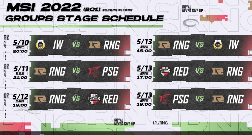 另外一个不妥的地方,就是赛程的结束,A、B、C三个小组,最先结束的赛程的是B组的RNG战队,虽然提前结束和后续结束相差的时间不多,但对于职业战队来说,提前结束MSI小组赛赛程,可以尽早的休息并筹备后续比赛的战术以及规划。