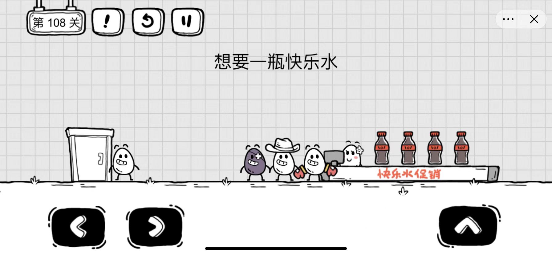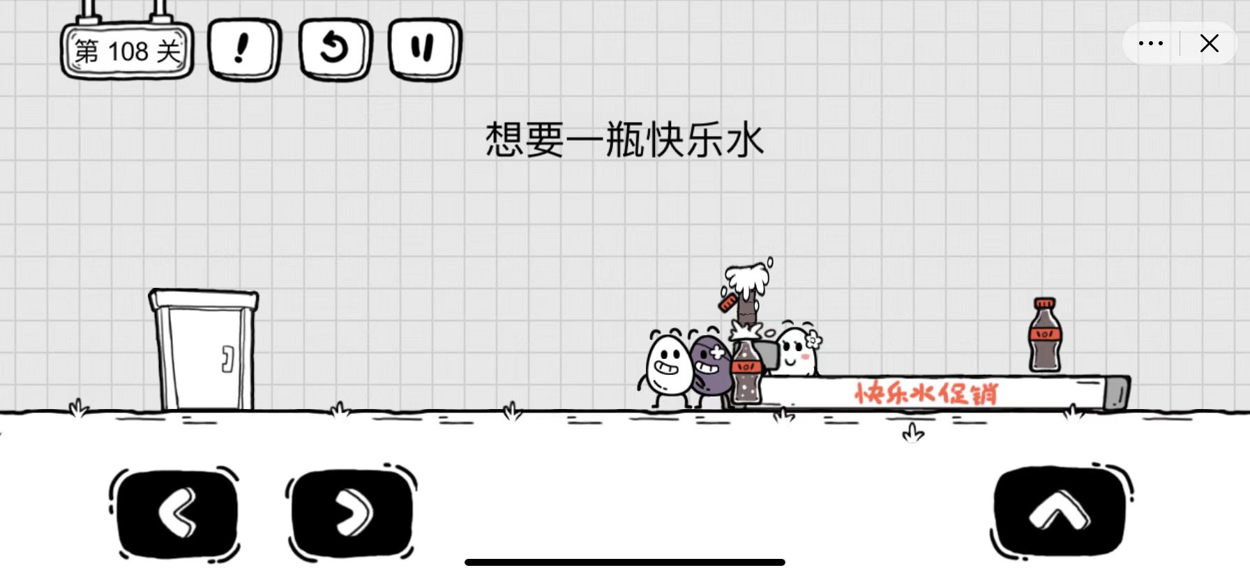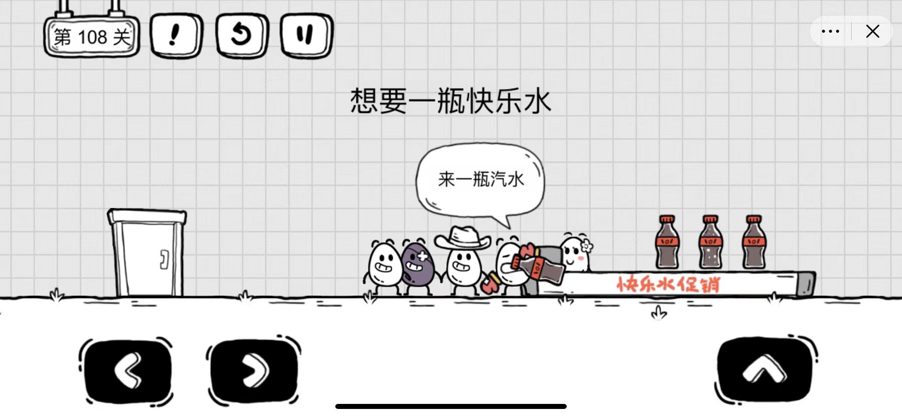 茶叶蛋大冒险中有很多的关卡,不少玩家都来到了第108关,本关卡的提示是“想要一瓶快乐水”,本关中有4瓶快乐水,黑色茶叶蛋会要求再来一瓶快乐水,我们就没有了,接下来小编就给玩家们带来了第108关通关攻略,感兴趣的小伙伴一起来了解一下吧。