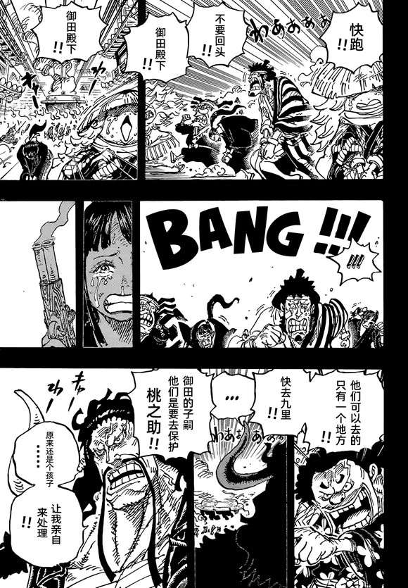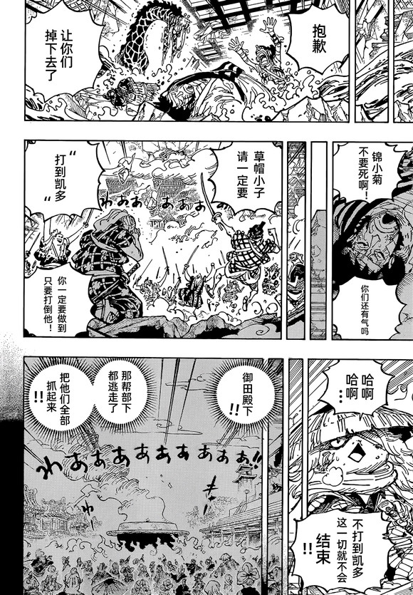 之后是乌索普这边,因为之前的大水,锦卫门和小菊两人被从长颈鹿的背上冲了下来,这个时候鬼岛的武士,都在祈祷路飞可以战胜四皇凯多,而在昏迷的锦卫门想到了当年光月御田被杀的情景。