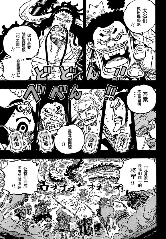 以上就是海贼王1048话的所有漫画,这一话之中,尾田算是彻底地展示了和之国民众悲惨的20年生活,不过这悲惨的20年,除了大蛇将军的原因,光月御田本身的问题也很大,如果当年他和雷利等人一起回到和之国,也就没有这么多事了!不过现在大蛇将军战死,和之国的民众算是真的解放了。