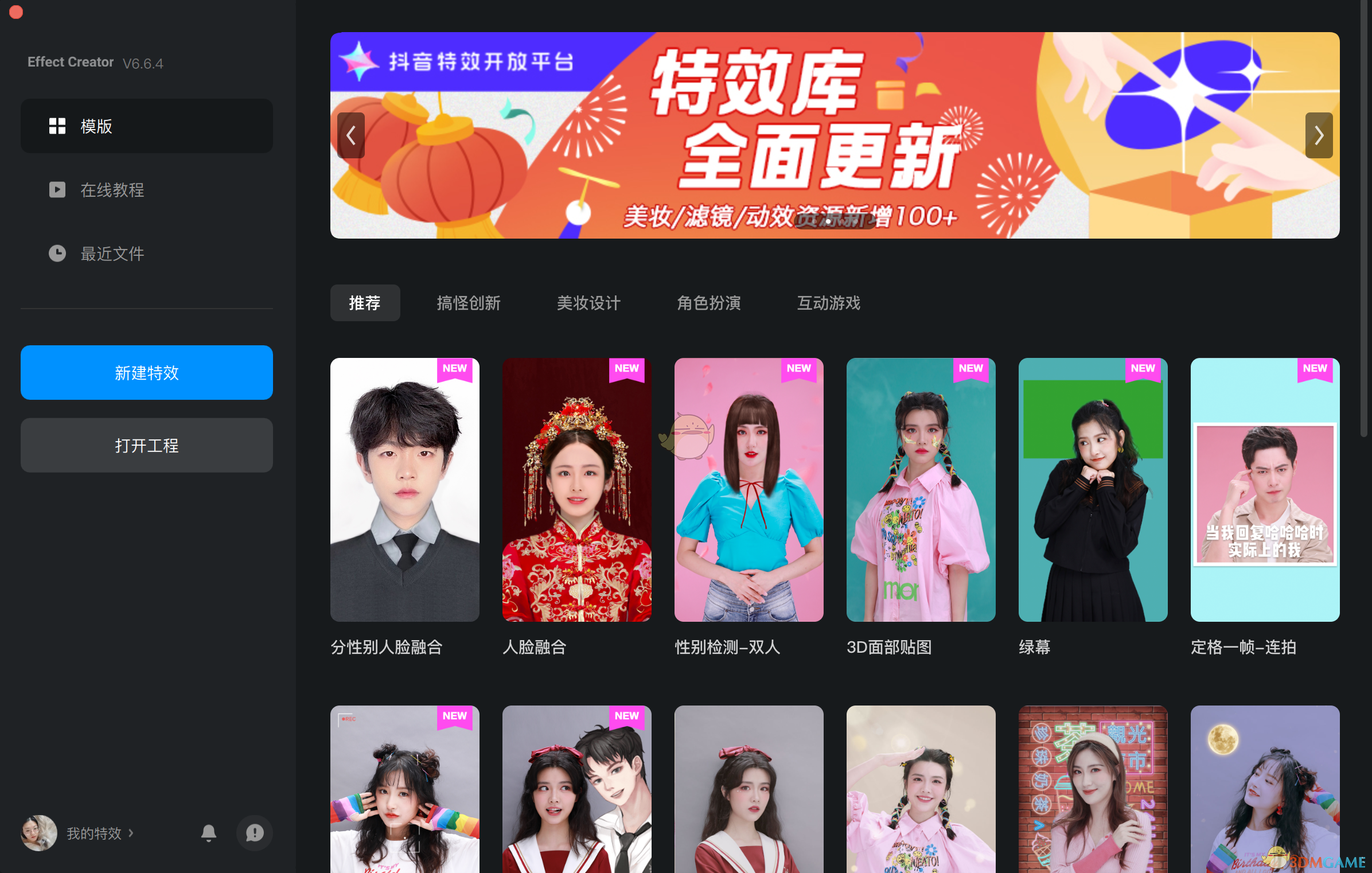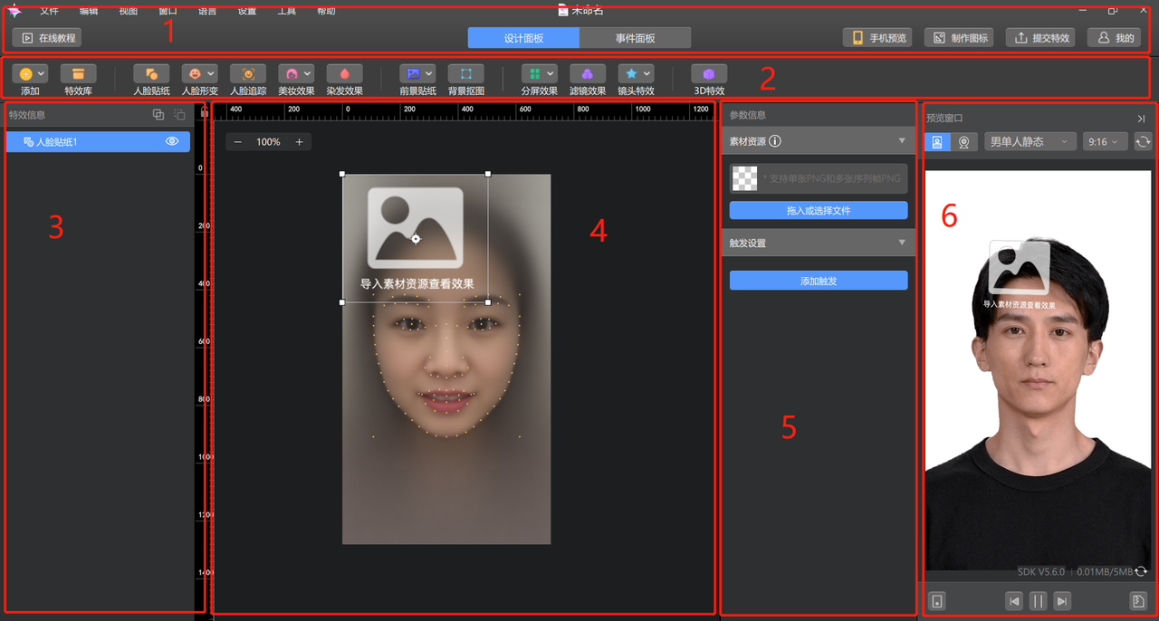 2、同时,抖音特效开放平台还为特效创作者提供了一款方便快捷的抖音视频特效创作工具——Effect Creator。对于很多从事设计工作的小伙伴们应该都有过被“不会用设计工具空有一腔灵感的恐惧”所支配的时候,而这种恐惧并不会出现在大家面对Effect Creator的时候。因为它的设计面板分区很友好,可以让人一目了然地明白对应分区的用途。