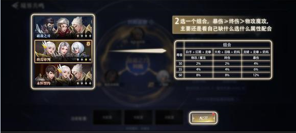 3、选一个组合,爆伤>终伤>物攻魔攻,主要还是看自己缺什么选什么属性配合。