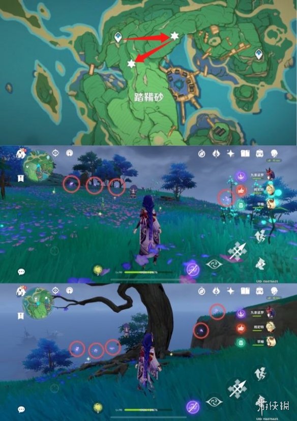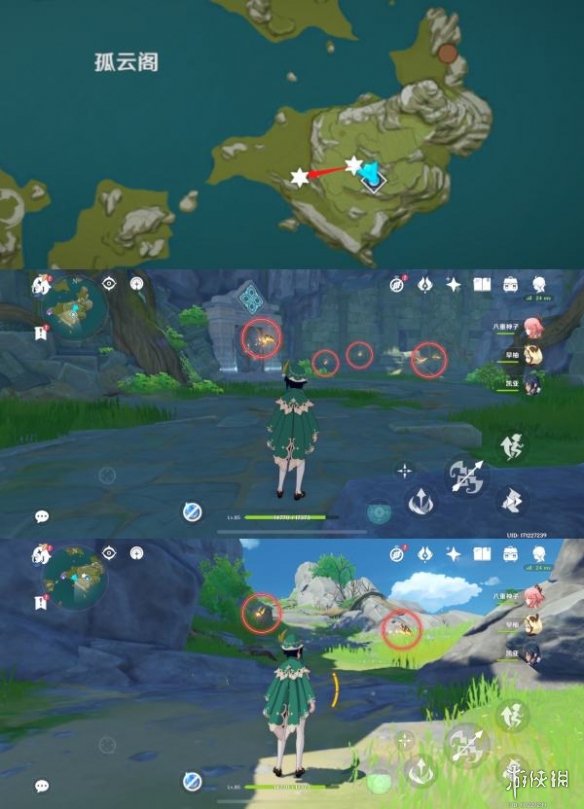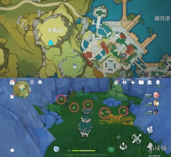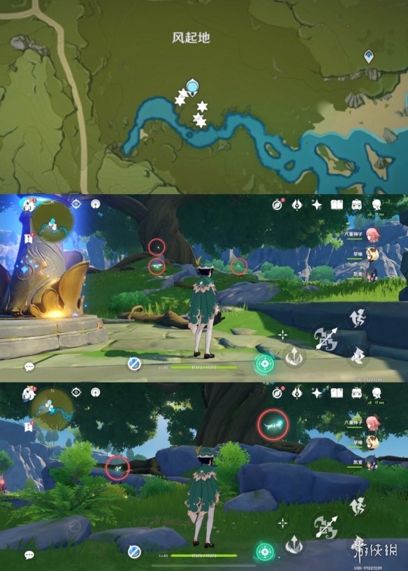 1.风起地的七天神像处,在大树周围有5只晶蝶,点位如下。