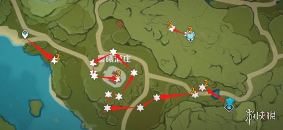 5.在如图踏鞴砂点位,一共9只晶蝶,按照图中路线即可。