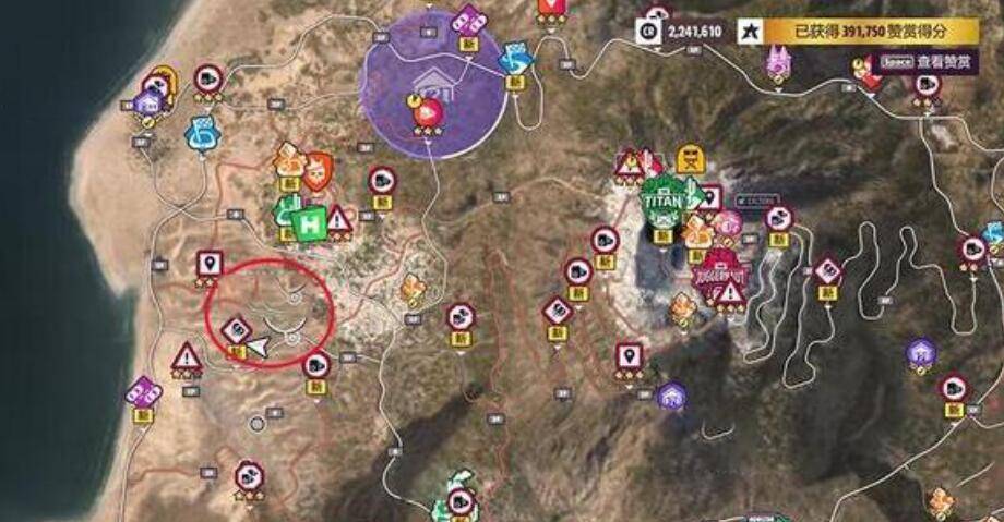 极限竞速地平线5白色沙丘在如图所示的巴哈地平线外面的地点,位于地图的西边取悦,小伙伴可以通过按m键打开地图,然后直接传送过去。
