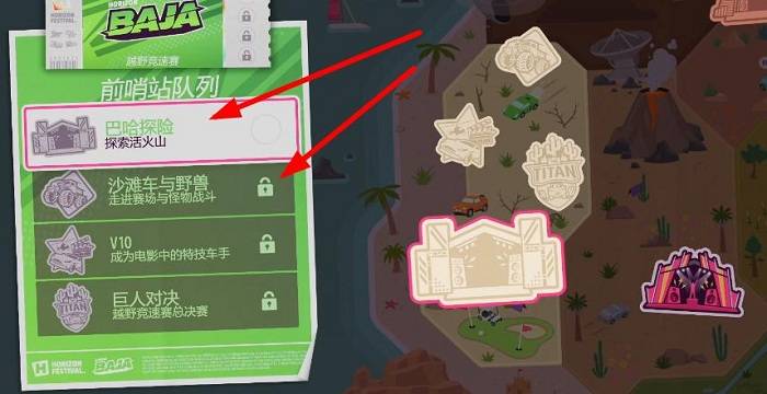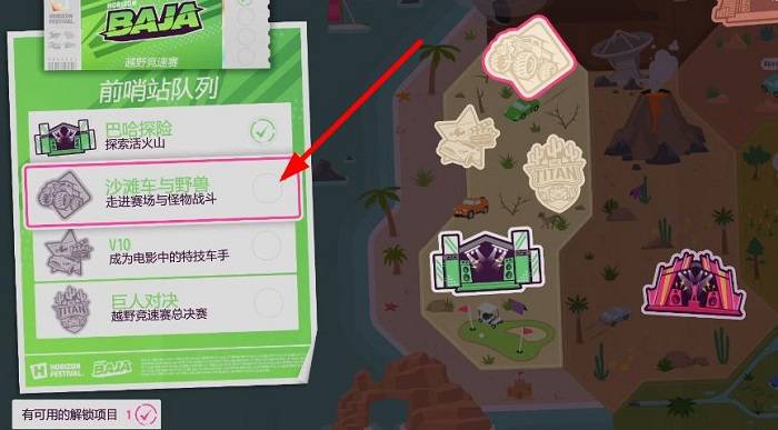 2、“巴哈探险”达成之后,回到这个列表页面就会发现后面的三个项目前部激活了,直接选择第二个“沙滩车与野兽”就可以传送到这场表演赛的位置。