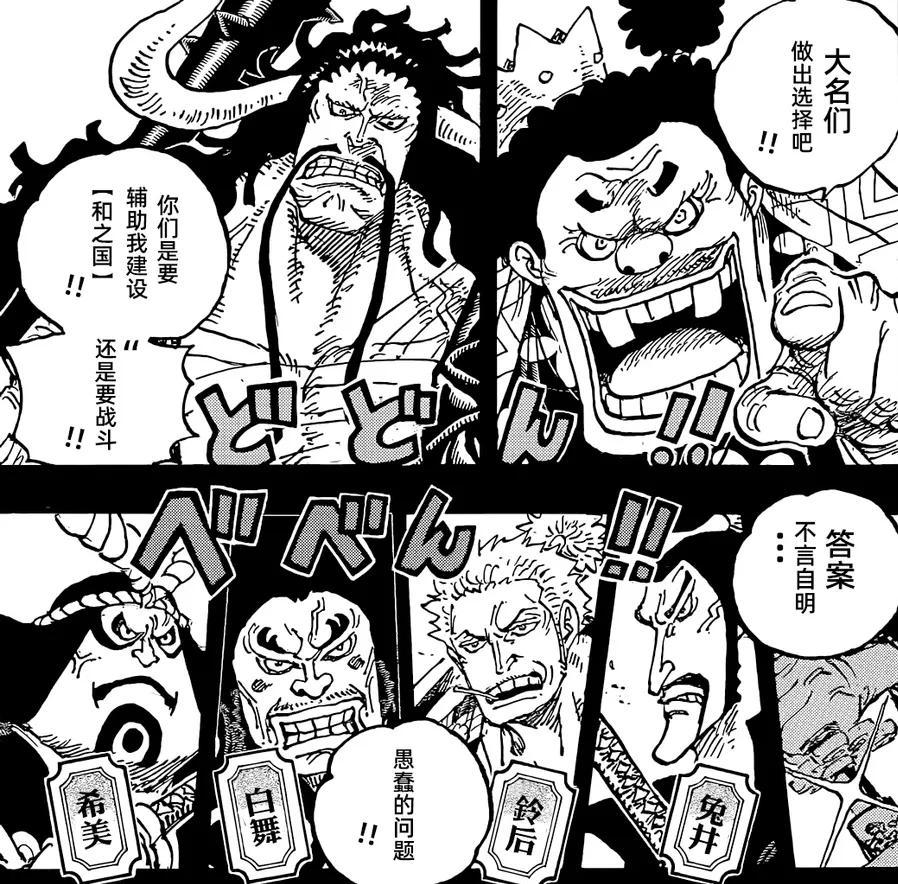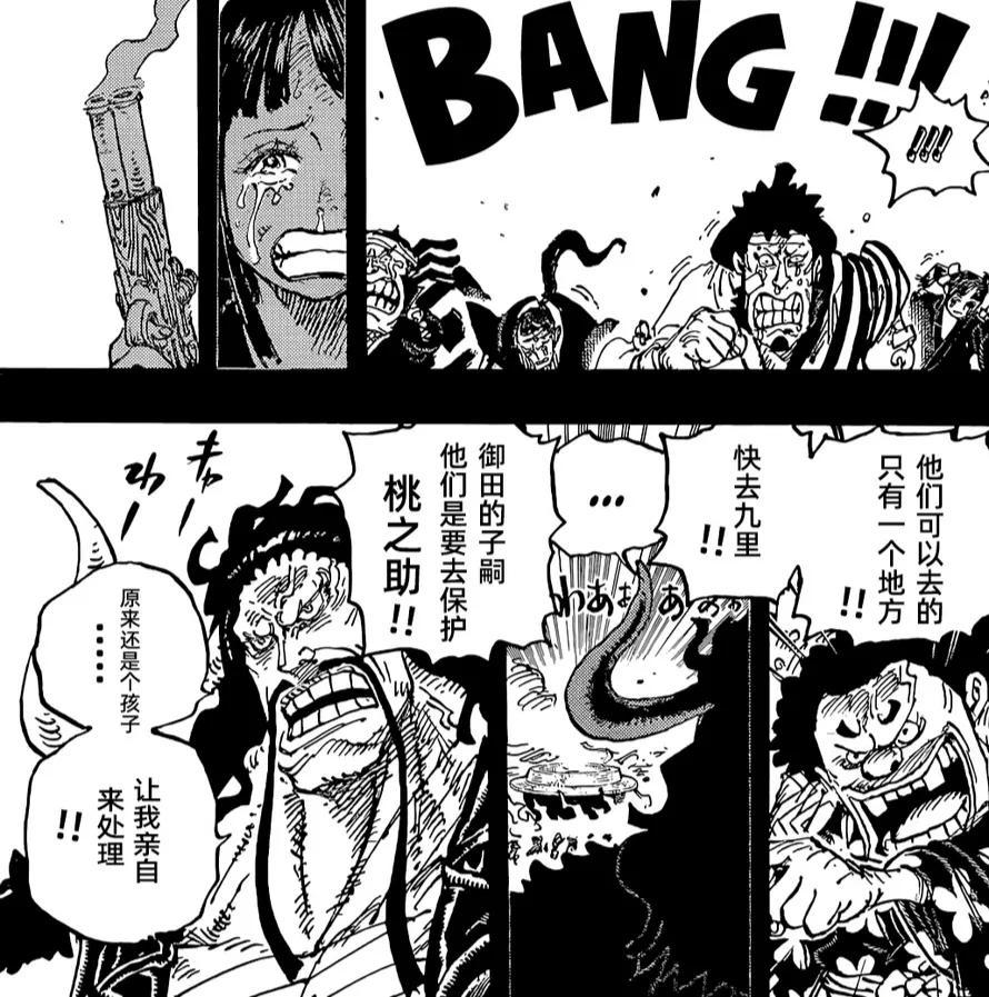 漫画最新一话的标题是二十年,从标题就能看出这一话的主要内容,剧情以回忆为主,讲述二十年前的事情。凯多和黑炭大蛇狼狈为奸,他们斩杀了光月御田,御田一死,和之国就彻底成为凯多的势力范围。九侠虽然没有死,凯多并不打算放过他们,就连御田的老婆孩子都不能放过,凯多亲自前往九里地区。