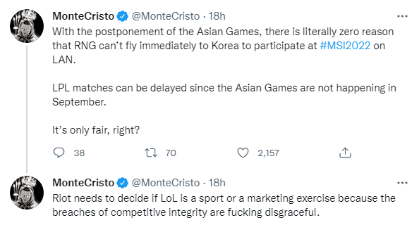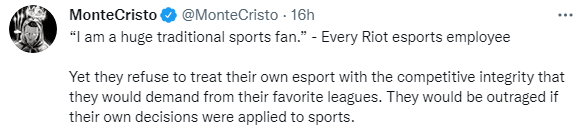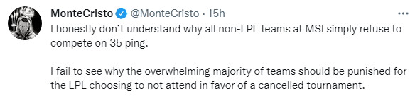 前LCK英文流解说Monte Cristo在推特上就MSI的35延迟规则对LPL及Riot进行的指责。