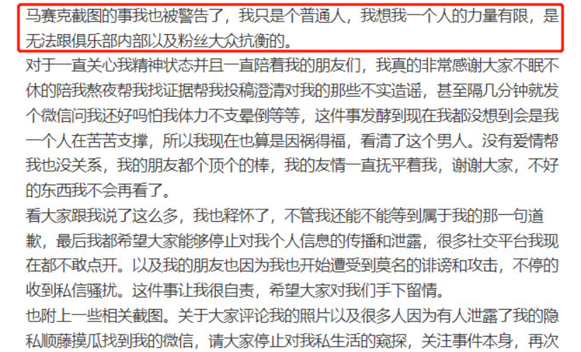 再往后Knight风波逐渐平息,正如贝贝所言,这一切反倒成了“两位女生的独角戏”,就在5月7日,Knight前女友贝贝说出不再爆料的隐情:因为马赛克截图的事情,我被警告了,我是一个普通人,无法以一己之力抗衡俱乐部内部、粉丝,感谢大家的支持,负面的评价不会再看。