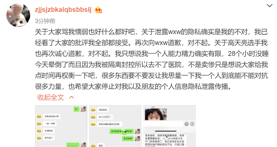 贝贝接着写道:透露WXW的隐私确实是我的错,我接受大家的批评,也对WXW说声对不起,再次向无辜卷入风波的Tian致歉,请大家给我时间权衡,我需要时间思考自己能否对抗很多力量!随后晒出和主播临界的聊天截图,两人经历了相同的遭遇(被警告),贝贝开始寻求法律界朋友的帮助。