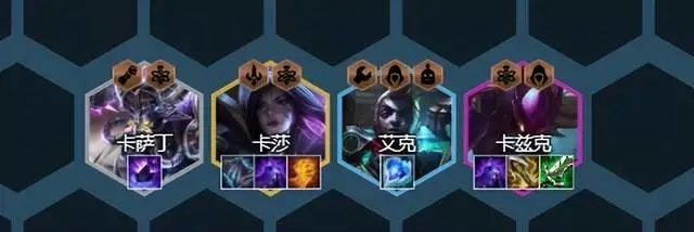 英雄组成卡萨丁、卡蜜尔、基兰、艾克、萨勒芬妮、卡兹克、卡莎、金克丝、希尔科