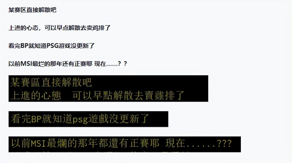 有PTT网友就表示,面对外卡巴西赛区,才18分钟就被打成8:0,经济输5k,完全想不到怎么赢?可以看得出来PSG的表现让很多网友比较失望。在很多网友看来,PSG应该是仅次于RNG可以出线的第二支队伍,现在看来,情况就变得扑朔迷离了。还有网友表示,就这还想碰瓷RNG?完全不够RNG打,还怎么出线。因为再次之前,PSG官方多次内涵RNG,还以为PSG很强,结果连外卡队伍都打不赢。