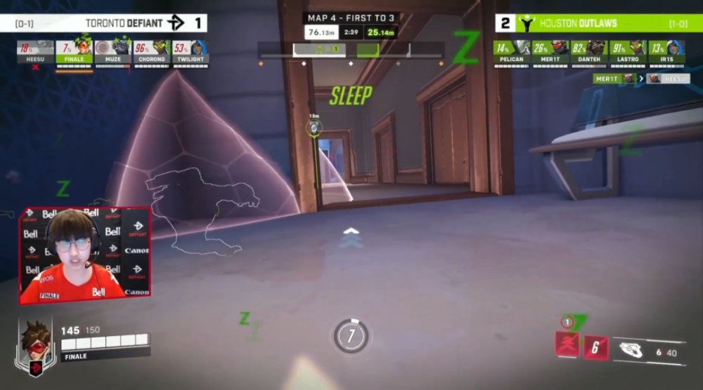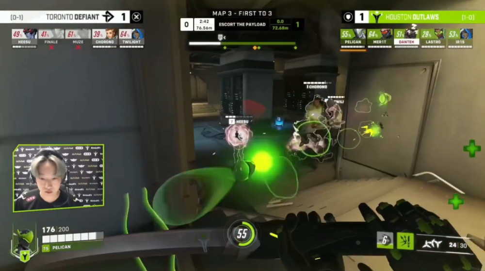 最后一个点,我倾向于神枪手在协同上出现了问题。不谈PELICAN更换源氏后配合铁拳的施压没有成效,单论时间还剩两分多钟时,FINALE在神枪手后排附近被IR1S睡针命中,但居然没有人过来集火将其击杀。虽然捍卫者的正面团战失利,让人没想到的是这个猎空居然坚持了接近20秒,才被集火打死。FINALE拖延的时间换来捍卫者的重新集结,也让随后在大招轮次占优的他们轻松赢下团战收复自己主场多伦多。