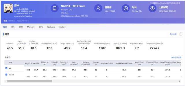 一加10 Pro在《原神》的测试中表现符合其定位,能效控制的也比较不错,2754.7mW的表现也在众多旗舰机中表现亮眼,平均每十分钟的卡顿次数是51.5,平均每十分钟严重卡顿次数是40.5,在游戏流畅性方面还需要提高。