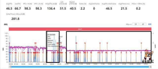 通过上述约26分钟游戏长呈现出来的帧率图表来看,游戏运行在约7分钟左右出现掉帧现象,此时科技犬正在进行第二个日常任务,在游戏中面对多个敌人后游戏人物释放技能进行战斗,此时画面出现较为明显的掉帧和卡顿现象,游戏约9分钟后也就是完成第二个日常任务(战斗时长约2分钟),帧率恢复到游戏初始状态,但是1分钟过后(游戏总时长10分钟)又出现掉帧现象,游戏流畅度明显大打折扣。