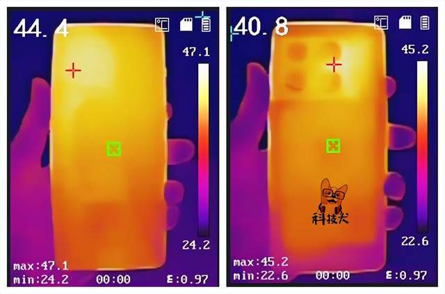 在实测环境中发现,一加10 Pro在极限画质60帧模式跑出了平均帧率46.5fps,机身正面平均温度为44.4℃、机身背面平均温度为40.8℃,通过热成像仪进行实测发现,热源主要来源内屏顶部区域及后置摄像头模组区域,整体热量分布较为均匀。