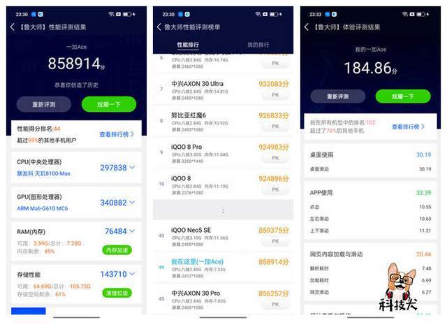按照以往惯例,科技犬首先选择使用安兔兔和鲁大师两款跑分软件做了跑分测试(开启性能 模式)。实测小一加Ace的安兔兔成绩为802355分,鲁大师为858914分,整体表现符合其定位。