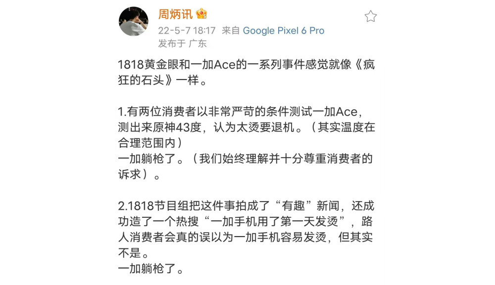 一加Ace的产品经理周炳讯知道这个事情之后也发文吐槽,他表示“没有找1818合作”,整件事情一加什么都没做,光躺枪了。最后“消费者满意了,媒体有话题了,1818赢麻了。”,但好在“一加Ace证明了自己不烫”。