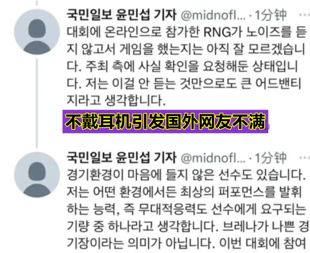 不过RNG这次MSI拿下首胜,和我们一开始预想的一样,还是引起了不少人的不满,这不,LCK的记者在比赛结束之后,就发出了质疑的声音,直言RNG在这场比赛中,有选手没有戴耳机,并且还质疑RNG的耳机内可能会没有白噪音,这对RNG来说是一个大优势,然而这还没完,不光LCK的记者发出了质疑的声音,就连LCK的前职业选手同样如此。