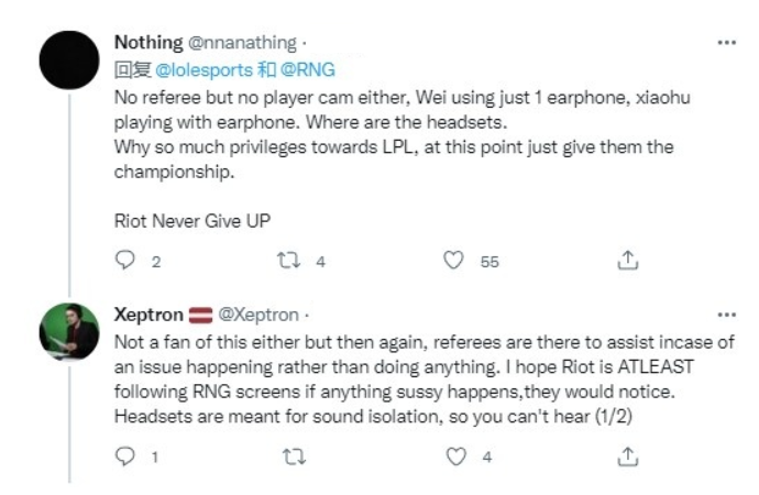 希望Riot至少直播RNG的屏幕,出现可疑的事情可以注意到,耳机是为了隔音的所以你听不到。