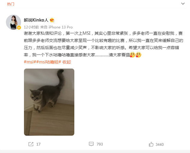 之前管泽元在一次接受采访时表示:LPL解说台其实是非常缺人的,非常需要有实力的新人涌入。而与此同时,不少老解说也因为个人原因离开了这个舞台,其中包括长毛还有柯基等等。不过像瞳夕,鼓鼓,毛毛这样的实力新解说出现,也算弥补了老人退位的空缺。而就在本届MSI上,美女解说kinko却突然火了起来,虽然解说中有一两句失误,但她的业务能力征服了不少LPL观众。
