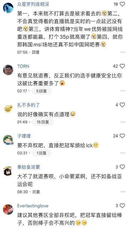 很多中国网友也发起了反击,纷纷吐槽他们这是没事找事,小编看到有网友的评论就说得很透彻,首先这场比赛我们赛区有意退赛,好好准备夏季赛的,但是突然觉得缺少LPL的msi是不完整的,所以要求我们线上参赛,第二,比赛直播和现场打比赛是有延迟的,延迟的时间也挺久的,根本不存在报点的问题,第三就是韩国网友说的体育精神,这位网友拿出当年WE拔网线的例子嘲讽他们,第四点是吐槽他们场地还不如中国网吧。
