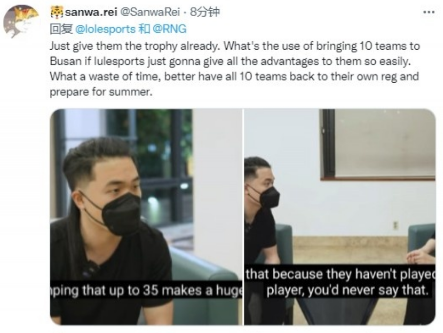 “直接给RNG颁奖算了!如果拳头官方能够这么轻松地就把所有好处给RNG,那么其他10支战队到了釜山有什么用?真是浪费时间!还不如让其他10支队伍回去准备夏季赛!”