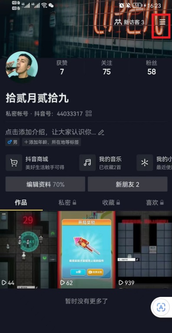 1、抖音的个人界面中点击右上角的【三】;