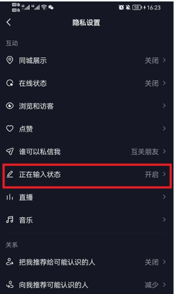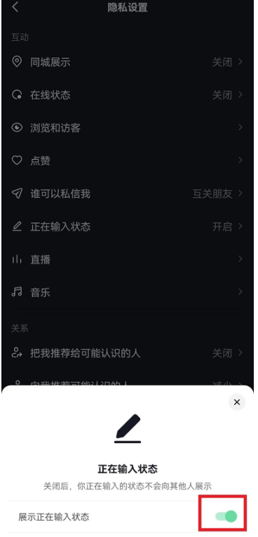 4、在隐私中就可以看到【正在输入中状态】打开功能选项;