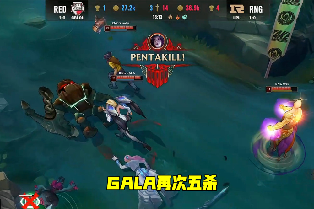 RNG重赛意味着首轮三场比赛不算数,GALA卢锡安豪取MSI首个五杀,以及16个总击杀打破尘封了七年的纪录都化成泡影,粉丝感到很可惜。第一次五杀不算?那就再拿一次!RNG第二次对阵RED的比赛,GALA使用卡莎再次斩获五杀,推高地时再砍下三杀,这就是LPL,这就是顶尖AD!观众纷纷帮GALA整活:到底还要再拿几次五杀才算?