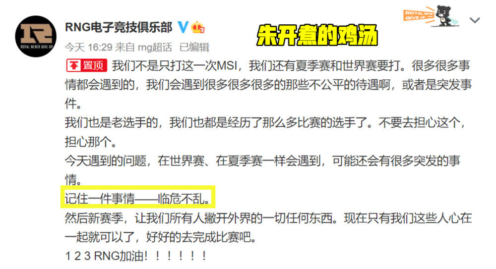 RNG重赛的消息下来后,粉丝都在担心选手心态受影响,但是大家别忘记了,他们有号称“世一汤”的朱开教练!比赛开打前,朱开暖心安慰选手,新鸡汤语录让大家泪目:“我们不是只打这一次MSI,还有夏季赛和世界赛要打,还会遇到很多突发事件。我们都是老选手了,请记住一件事——临危不乱,我们心在一起就行!”