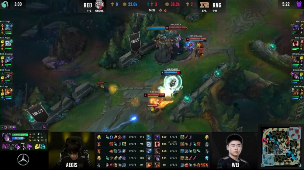 比赛一开始,小Wei通过在上路的一波耐心蹲伏就拿到了格温的一血,但是己方下路的泰坦也被抓死了。8分钟时,RNG本来是想动先锋的,但是意识到自己家中野的战斗力不如对面,就果断放弃了先锋。14分钟时,小Wei一个漂亮的回旋踢踢回了烬,小虎和Gala果断将其秒掉,在后续的拉扯中,Gala再收一个人头,RNG的经济领先5千。