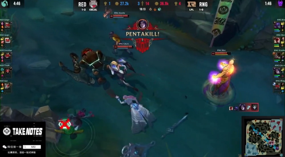 北京时间5月13日,在MSI的第三个比赛日里,拳头官方因为延迟的事,突然要求RNG重赛,为了公平,RNG也只能默默接受了。最惨的是前面的成绩也都要取消,这包括Gala在本届MSI上拿到的第一个五杀。打排位时,我们都知道五杀有多么难拿,更何况是职业赛场,整整一届比赛能出一个五杀都算是凤毛麟角了,所以大家对此都是觉得非常可惜和气愤。不过,在刚刚结束的比赛中,Gala也是再次拿下了五杀,同样是第一个,同样是面对RED,仿佛是在告诉所有人:属于我的,就是我的,你们谁都拿不走。解说米勒也是直接锐评:解气。