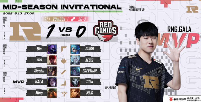 北京时间5月13日,MSI季中赛RNG与RED的小组赛对决已经正式落下帷幕了。在这一场焦点的大战中,RNG延续此前的神勇状态,AD选手Gala再度与RED的对决中取得五杀,RNG用时不到21分钟就成功击败对手赢下比赛。