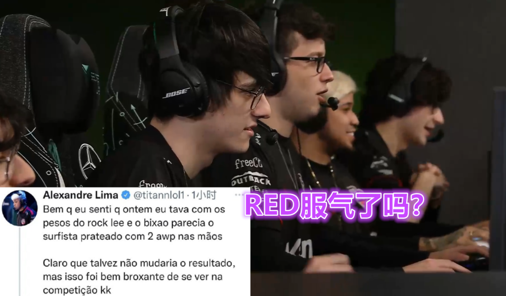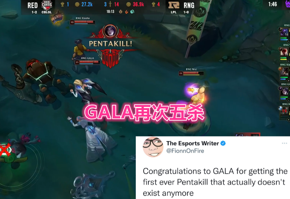 GALA在两天之内收获两个五杀,对手还是同一个战队RED。昨天RNG战队面对RED劣势地狱开局,好在RNG对线运营完爆对面,10分钟就把局面逆转了。但RED下路选手TitaN似乎有些不服气,在拳头官方宣布RNG重赛以后他发文说道:“昨天我打比赛的时候感觉像是戴着小李腿上的负重在打,而对面的GALA像个神一样。 ”