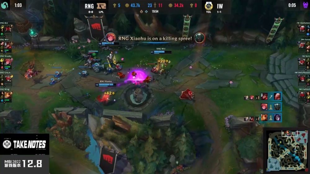 随后IW众人入侵RNG红buff野区,惨被RNG打出一换二,转头IW下路抓死Gala,但也是被RNG支援赶到击杀两人,顺势拿下第一条峡谷先锋以及第一条小龙科技龙,此时RNG经济领先三千左右!