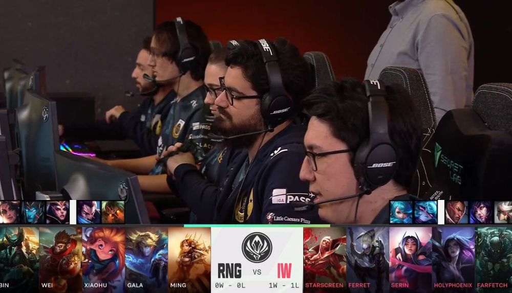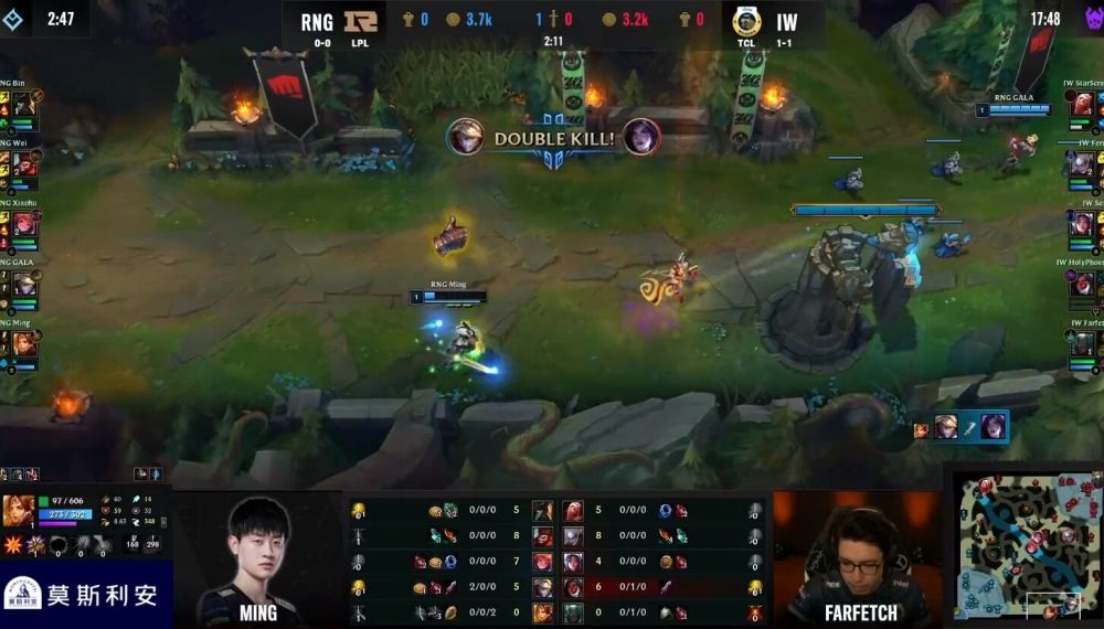 比赛前期:双方正常开局,RNG下路一级对线击杀IW两人,Gala拿下双杀,同时中路IW刀妹上头也是被RNG中野击杀;5分钟,RNG四包二下路越塔击杀IW双人组,同时上路阿Bin船长一打二打出一换一;