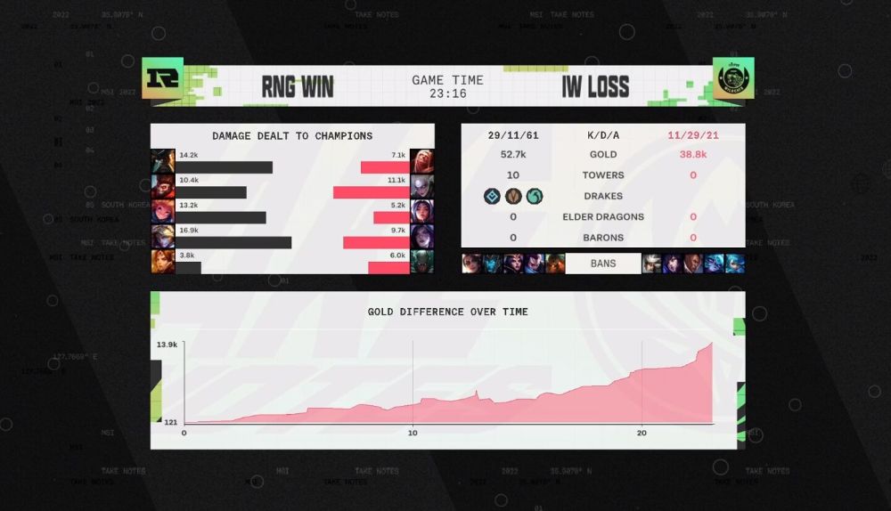 比赛后期:RNG选择下路推进,IW眼看大势已去,依靠高地开团,但在巨大的经济装备差距下,RNG势如破竹打出零换五完美团战,23分钟左右,RNG顺势一波结束比赛,恭喜RNG轻取IW拿下重赛后的首胜!