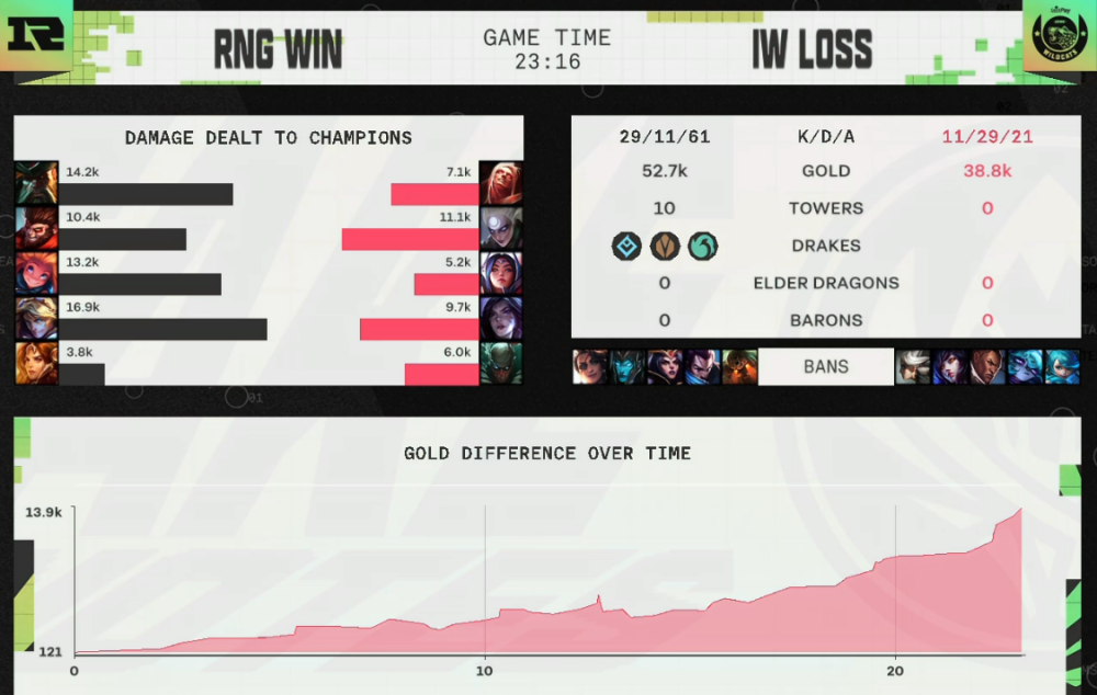 与此同时,RNG这一局比赛前期虽然打得很凶,但依旧是打出了非常稳的运营,并没有让IW拿到任何一座防御塔以及小龙。最终,凭借着巨大的经济优势,RNG轻松拿下了这一局比赛的胜利。同时,也完成了对IW的零龙塔。