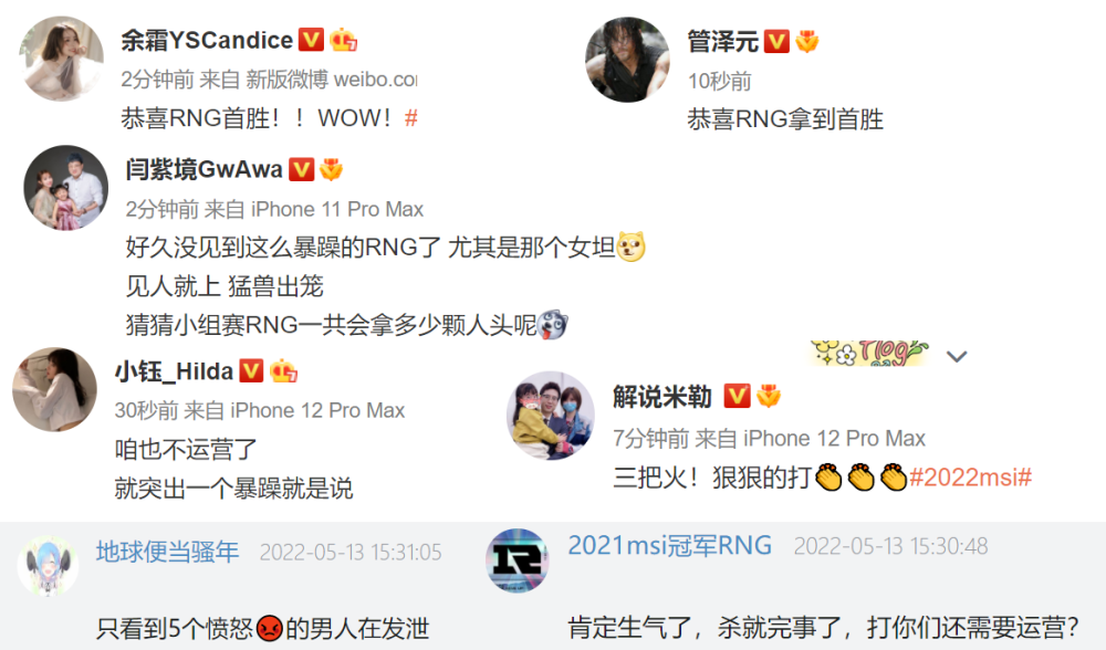 赛后LPL解说纷纷发文热议,余霜和管泽元恭喜RNG拿到“首胜”,小钰表示RNG突出暴躁不运营了,米勒为RNG三把火下狠手而鼓掌:“三把火,狠狠地打!”娃娃则说道:“好久没见到这么暴躁的RNG了,见人就上,猛兽出笼,猜猜小组赛RNG一共会拿多少个人头?”