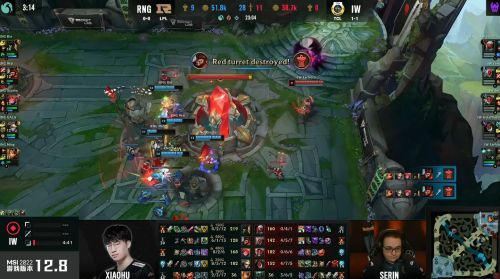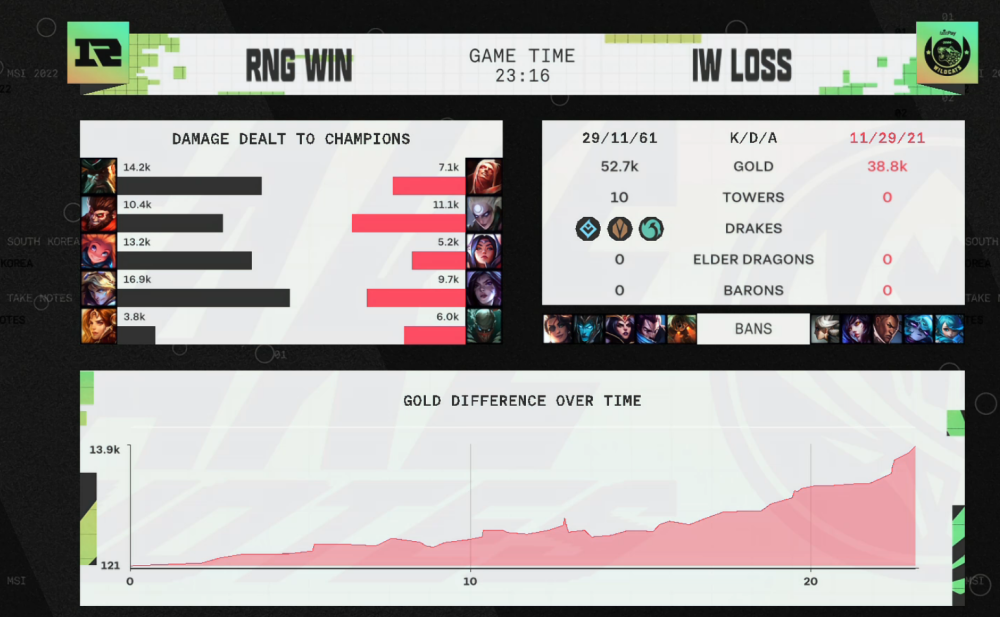 虽然中期RNG上头强行打架送出不少赏金,但BIN船长压了吸血鬼五十刀,上单差距非常明显,整体局面还是游刃有余的!随着上路二塔RNG团灭对手,经济差距瞬间拉到一万,IW刀妹吸血鬼劣势失去作用,下路高地强行开团也失败了。最终RNG战队顺利赢下本场比赛胜利,重新拿回MSI小组赛的第一分!