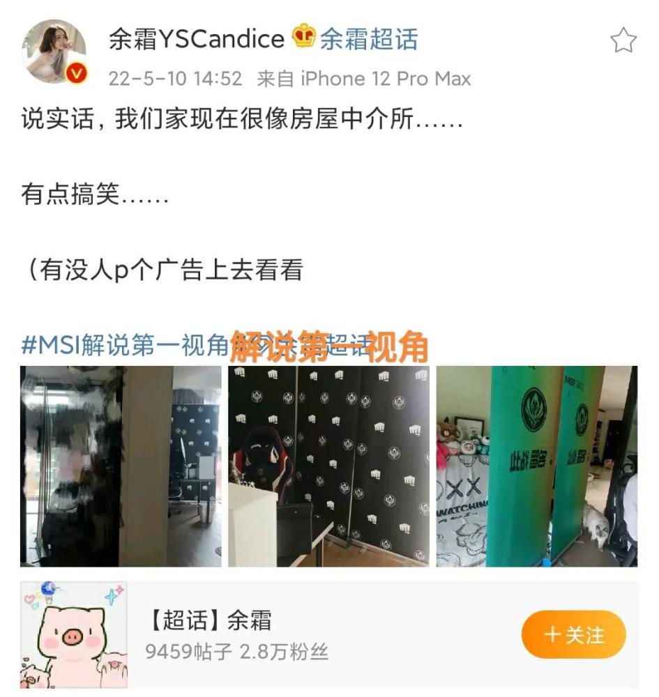 前言:S12赛季的比赛已经正式开始了,相信绝大多的玩家都关注了本次msi的比赛。Rng战队作为lpl赛区的春季赛冠军,在本次msi的对抗中发挥的非常出色,因为一些特殊情况的原因,lpl赛区只能线上参赛,而官方的解说和主持人更是十分的尴尬,只能在家中进行直播。这两天里,Lpl赛区的官方主持人余霜就晒出了在家办公的环境,能够看到她和管泽元是一人一个屋,两个人在工作的时候是互不打扰的。一些有意思的网友也是直接p了一下管泽元的背景图,金牌中介余霜一下子气质就上来了。